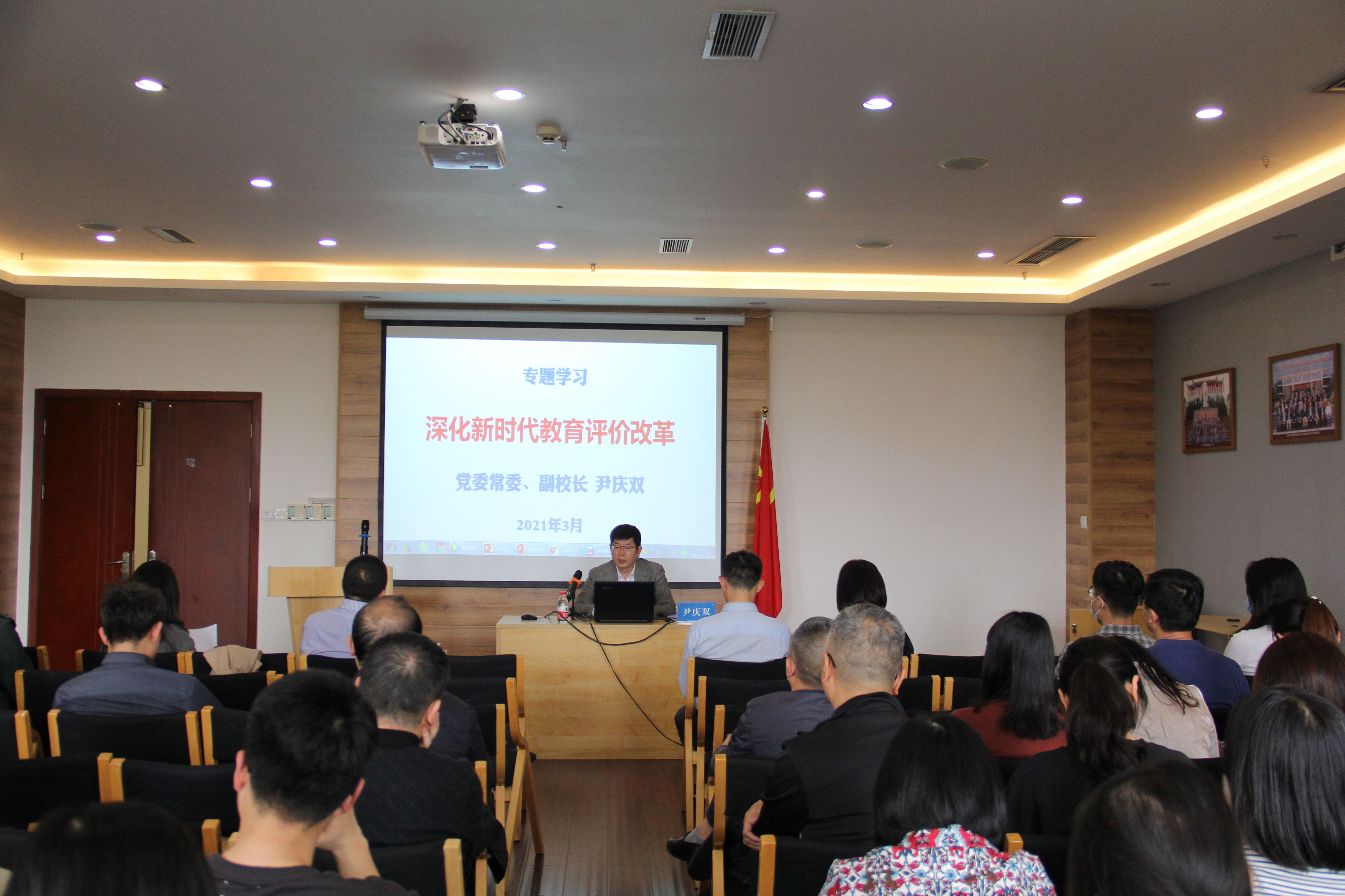 3月30日,澳门bet356体育在线官网举行深化新时代教育评价改革专题学习,党委常委、副校长尹庆双进行专题讲座,学院领导、学院全体教职工参加学习。