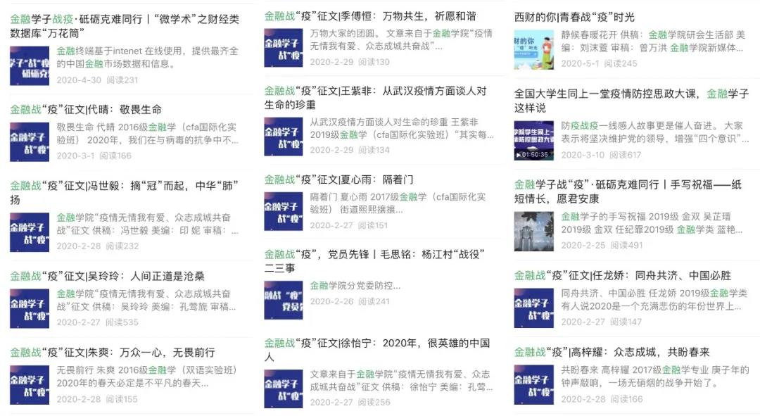 澳门bet356体育在线官网将思政教育创新与新媒体相结合,引导学生密切关注国家社会时事热点,培养学生家国情怀。疫情期间,学院官方微信公众号总计发布疫情相关推送百余篇,其中包括学院抗疫主题活动推文40余篇,院级及以上抗疫工作总结及部署文案推送10余篇,发布“澳门bet356体育在线官网分党委倡议书”“我是西财金融人,我承诺”等倡议推文,汇聚学院师生正能量,抗击疫情共克时艰;开设“金融战‘疫’,党员先锋”专栏,报道党员师生在疫情防控期间主动服务社会的故事;组建疫情应急研究小组,及时推出“西财·观点”系列疫情应急对策研究文章;推出“不忘初心、牢记使命”系列推送、建党100周年系列推送、“红色金融耀百年”党史学习教育系列微课程等特色栏目,立体化展示“标杆院系”建设情况,全方位展示拼搏向上的时代力量。