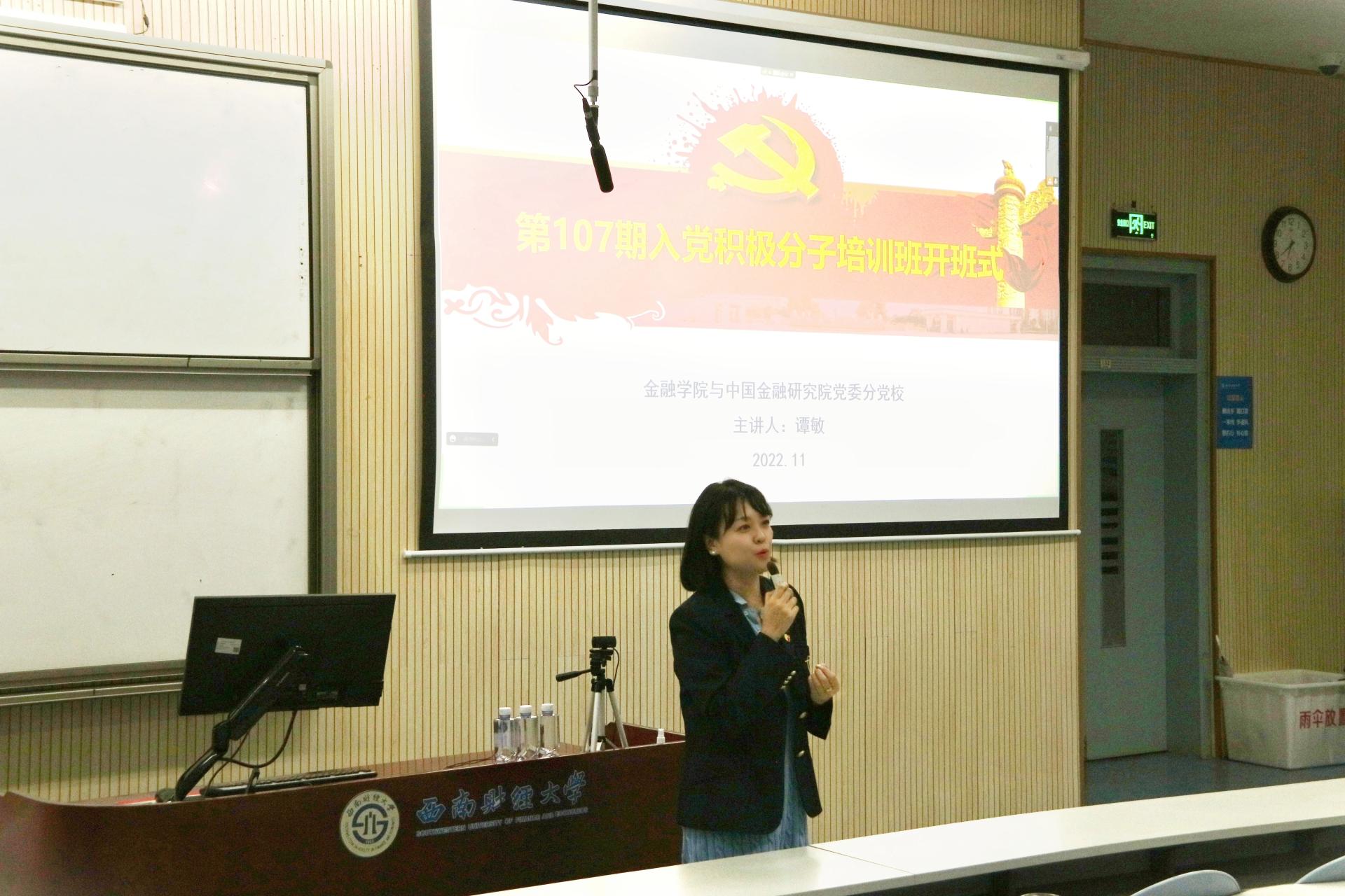 11月3日,澳门bet356体育在线官网分党校第107期入党积极分子培训班开班式在经世楼G102举行。澳门bet356体育在线官网与中国金融研究院党委副书记、纪委书记谭敏主持,全体积极分子培训班学员参加此次学习。