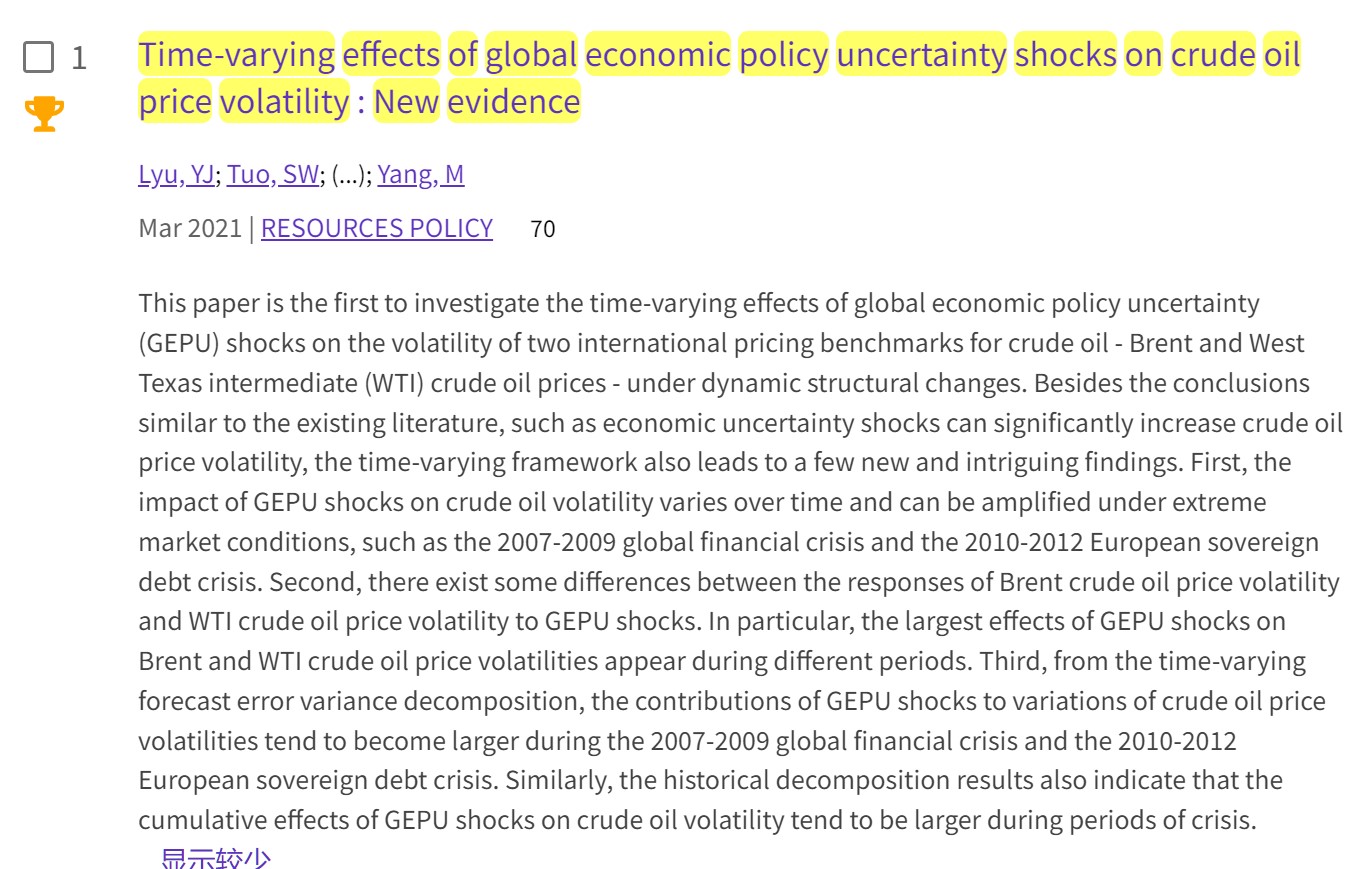 据近日公布的ESI(Essential Science Indicators)数据库最新统计数据显示,我院吕永健老师(第一作者)与中国金融研究院庹思伟博士,云南财经大学澳门bet356体育在线官网魏宇老师和东北财经大学澳门bet356体育在线官网杨默老师在《Resources Policy》(JCR一区)合作发表的论文“Time-varying effects of global economic policy uncertainty shocks on crude oil price volatility: New evidence”入选ESI高被引论文(Highly Cited Papers)。