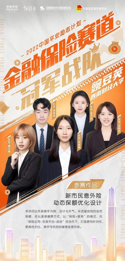 1月11日,由中国青年报社、中国青少年发展基金会、共青团深圳市委员会以及中国平安联合举办的2022中国平安励志计划年度总决赛正式在云端拉开战幕。入围决赛的12支战队围绕“城市新邻里,同燃青春梦”的主题展开巅峰对决。经过激烈角逐,我院2021级保险科硕朱慧琳、董小瑜、古颖秋、杨宇航、张思淇5位学子组成豌豆荚战队设计的《基于动态保额对新市民意外险的优化设计》作品夺得金融保险赛道一等奖;同样来自我院2021级保险科硕的林露等3位学子组成的另一战队获得该赛道优秀奖。