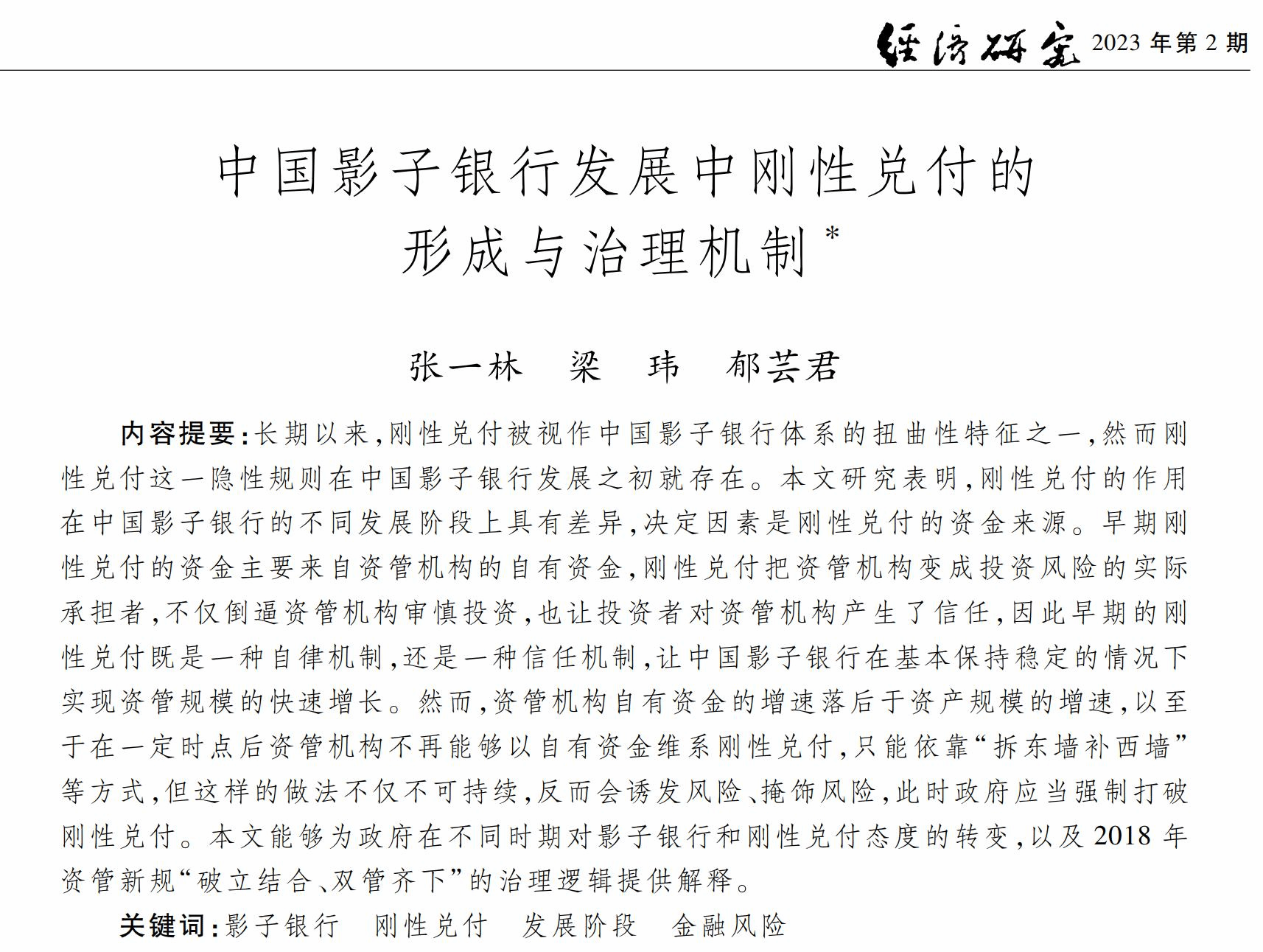 本文研究来源于中国情境下的现实问题。中国影子银行长期以来存在刚性兑付的隐性规则,但政府对刚性兑付的态度在不同时期存在显著的差异,从前期的隐隐支持转变为现阶段的强烈反对。由此而来的问题是,为何政府前后的态度截然相反?影子银行缘何形成了刚性兑付的隐性规则?禁止刚性兑付后,影子银行的风险会发生怎样的变化,应当如何防范?为了解答上述问题,我和来自中山大学的两位合作者构建了政府、资管机构和投资者的博弈模型,研究刚性兑付与金融风险的关系如何随着影子银行发展阶段的变化而变化。