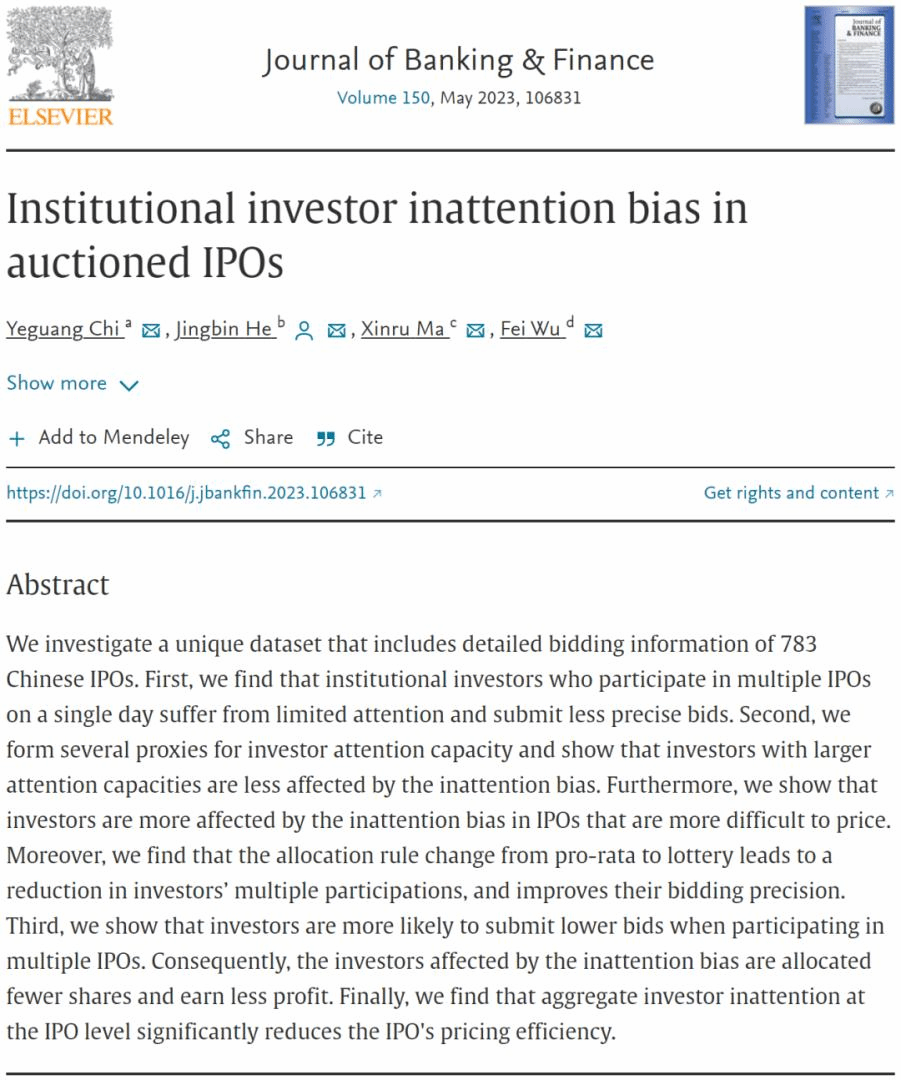 日前,澳门bet356体育在线官网贺镜宾老师(通讯作者)与上海交通大学上海高级澳门bet356体育在线官网吴飞教授、新西兰奥克兰大学的迟业光老师、四川大学马馨薷老师合作的论文“Institutional investor inattention bias in auctioned IPOs” 在国际著名经济金融类期刊Journal of Banking & Finance在线发表。